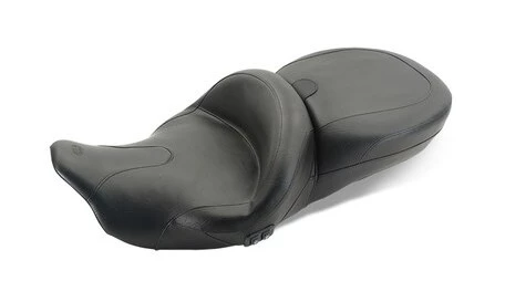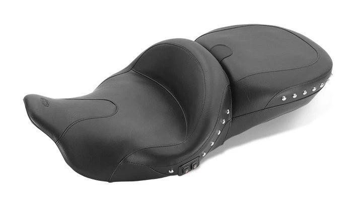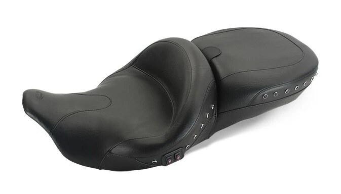 Both you and your passenger will experience the peak of comfort with the Summit Super Touring seat, designed for the 2014-Up Rushmore line. The one-piece super comfortable touring design provides the rider and passenger with the fullest, most comfortable seat possible. The 19″ wide Super front bucket sits the driver 1.75″ further back than the stock seat. The passenger seat is a full 16″ wide and fits perfectly with the Rushmore speakers and Tour-Pak. Seat will fit with or without a handrail. All heated seats come complete with a wire harness that hooks to the accessory port in front of the battery. This part is energized only when the ignition key is turned on and the accessory toggle switch below the handlebars is flipped up. Will not work with Harley Davidson driver backrest kits or Mustang driver backrests for Pre-2014 models. Receiver for the optional Mustang Driver Backrest is built right into the seat.