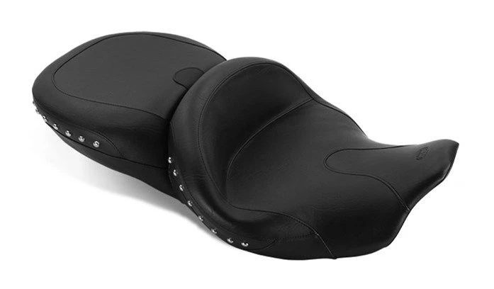 Both you and your passenger will experience the peak of comfort with the Summit Super Touring seat, designed for the 2014-Up Rushmore line. The one-piece super comfortable touring design provides the rider and passenger with the fullest, most comfortable seat possible. The 19″ wide Super front bucket sits the driver 1.75″ further back than the stock seat. The passenger seat is a full 16″ wide and fits perfectly with the Rushmore speakers and Tour-Pak. Seat will fit with or without a handrail. Will not work with Harley Davidson driver backrest kits or Mustang driver backrests for Pre-2014 models. Receiver for the optional Mustang Driver Backrest is built right into the seat.