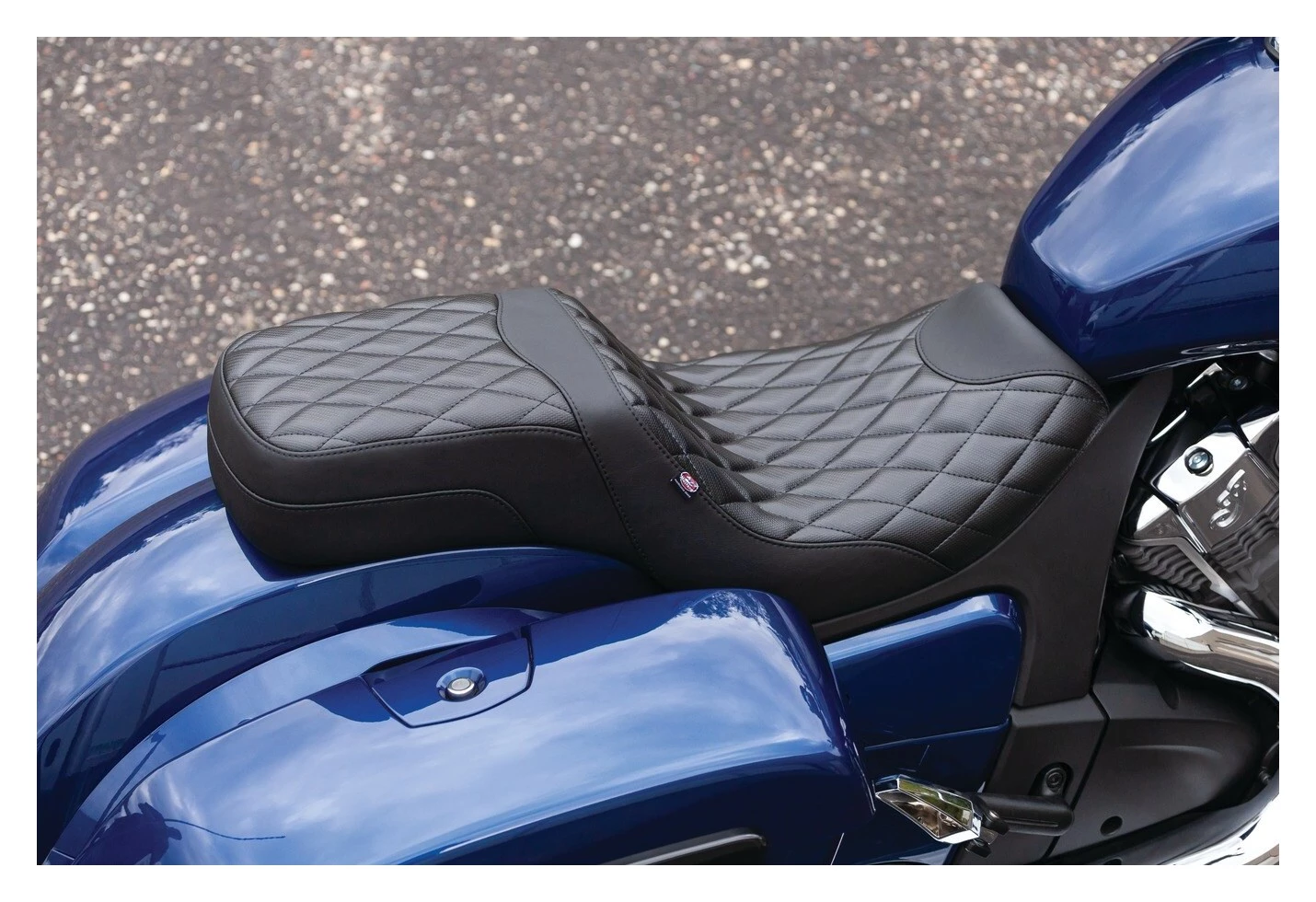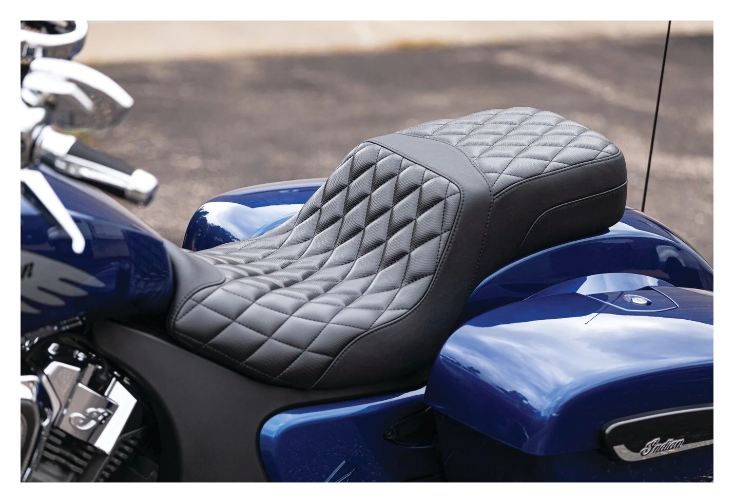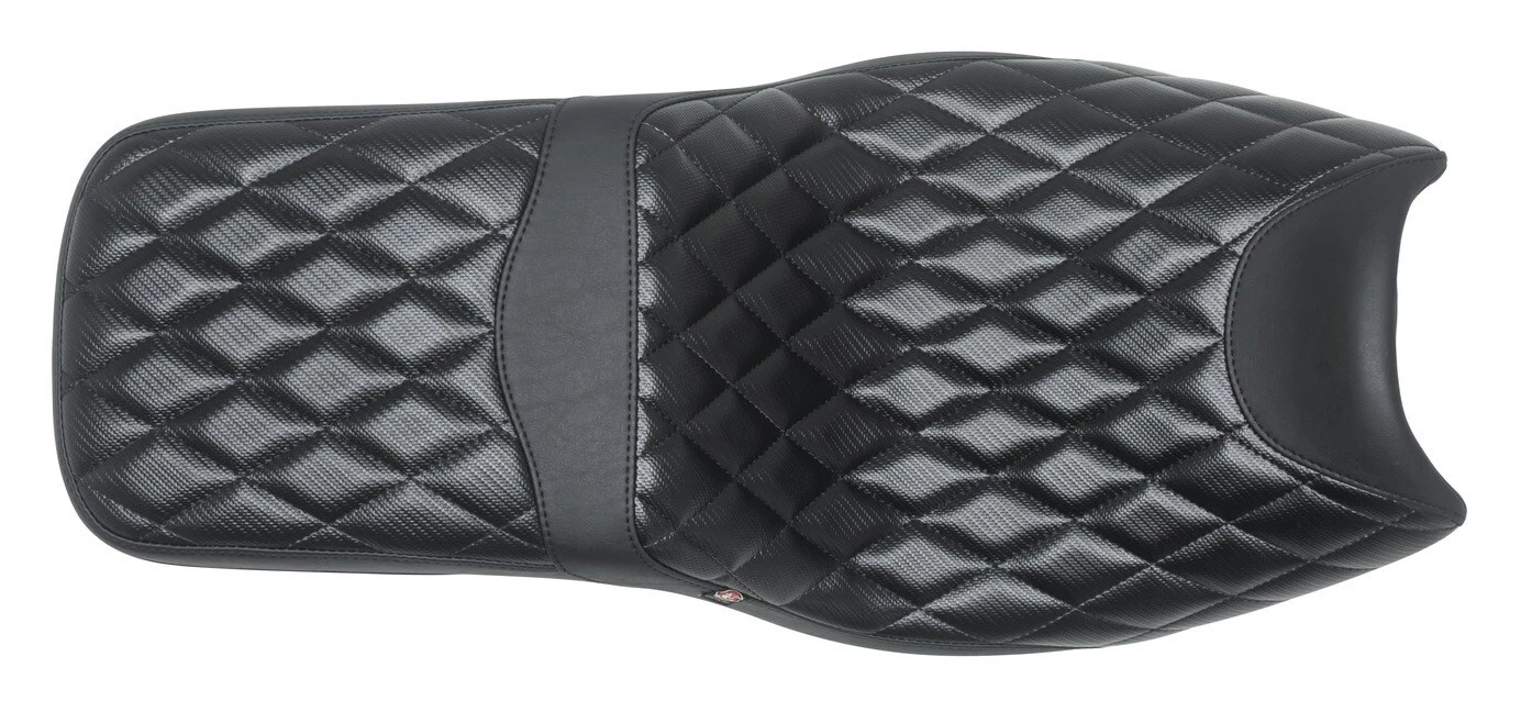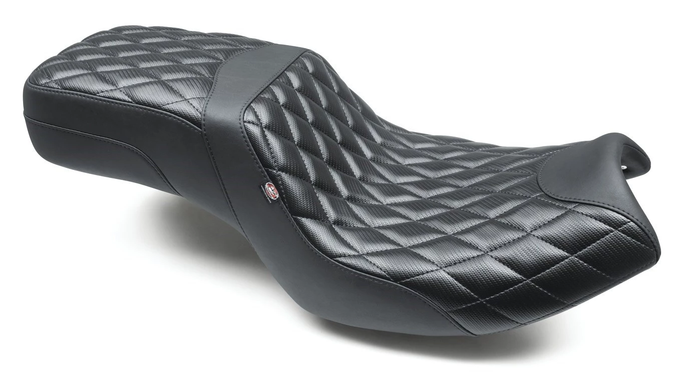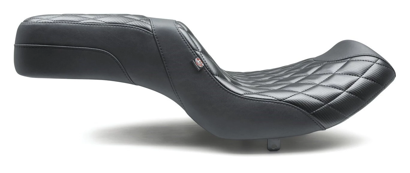 The hand-sculpted, wide bucketed rider area and signature Squareback wall keep the rider comfortably planted at a similar reach to the controls compared to stock.Ā Just like the bikeās performance, the Mustang Squareback seat delivers a sporty demeanor perfectly balanced with long-distance touring capabilities, whether cruising or hammering the throttle.Ā Mustangās proprietary controlled-density foam formula provides you and your passengerĀ ample support and comfort.Ā The perfect finishing touch is a handsewn cover blending our smooth and carbon fiber-style premium vinyl in a mesmerizing diamond stitch pattern.