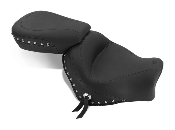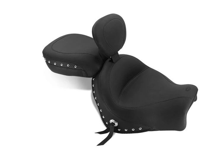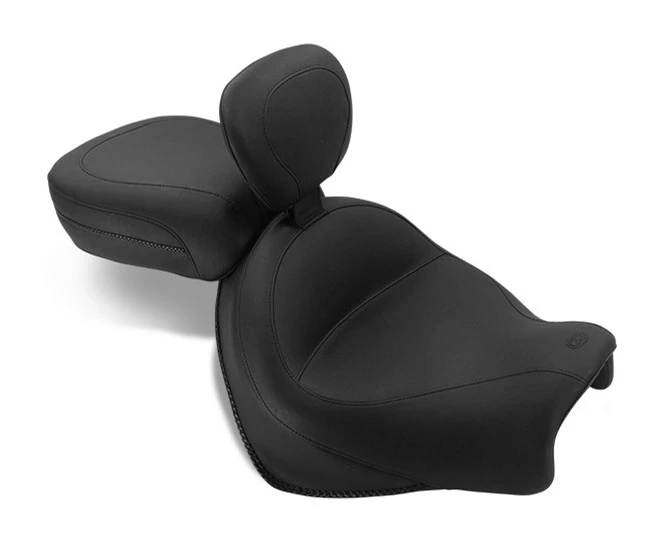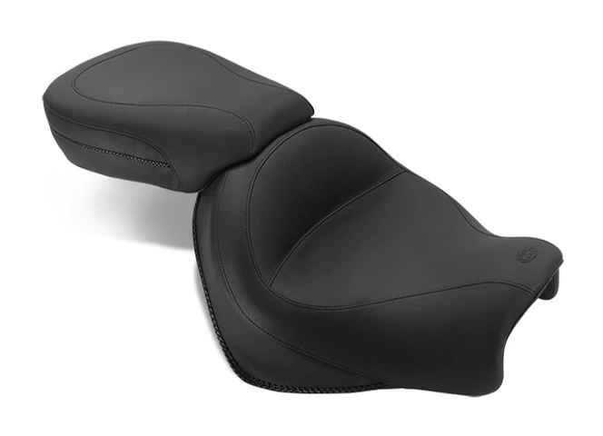 Mustangās driver seat is a full 17ā wide and sits you at the ideal cruising angle. Your passenger sits comfortably in a 12ā wide bucket that utilizes Mustangās unique internal steel support wings. All styles feature braided edge trim. The built-in driver backrest offers more features than any other backrest on the market!