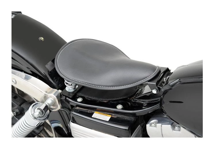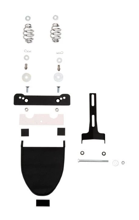 This solo seat kit includes springs, frame cover, hardware and instructions. The mount is powder-coated black and there is no welding required. The spring mount studs are stainless steel and all other hardware is zinc coated. Most other springs will also work with this kit.