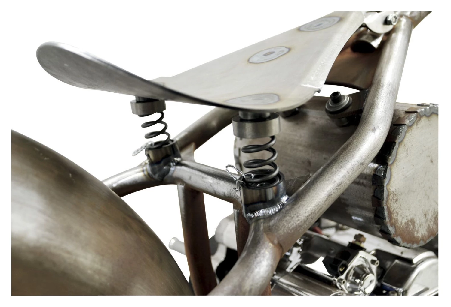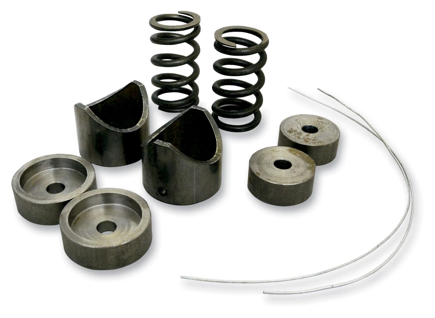 Solid steel. Why drive yourself nuts trying to get your fishmouth cuts perfect? Set down the file, and snap up a spring kit from LA Choppers. Kit includes spring perches for your seat pan and frame, two helical seat springs, and safety wire to ensure that your springs stay where you put them. Made in USA.